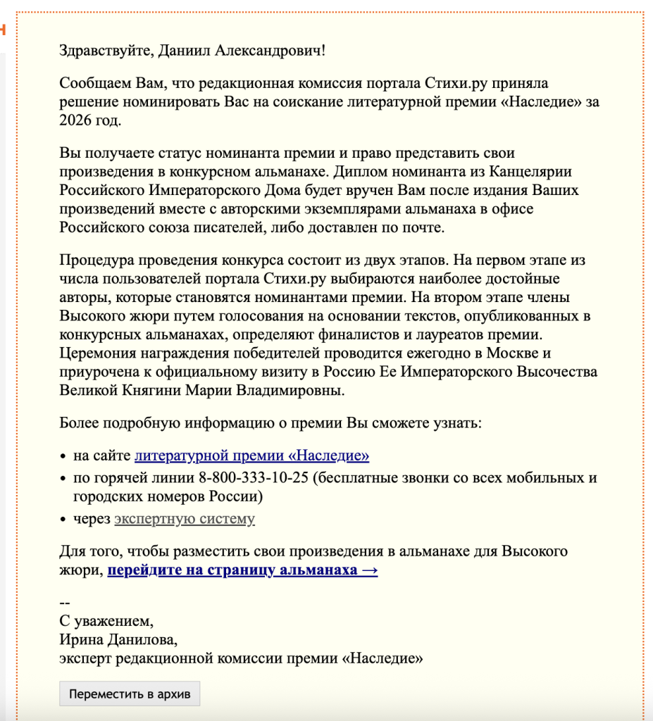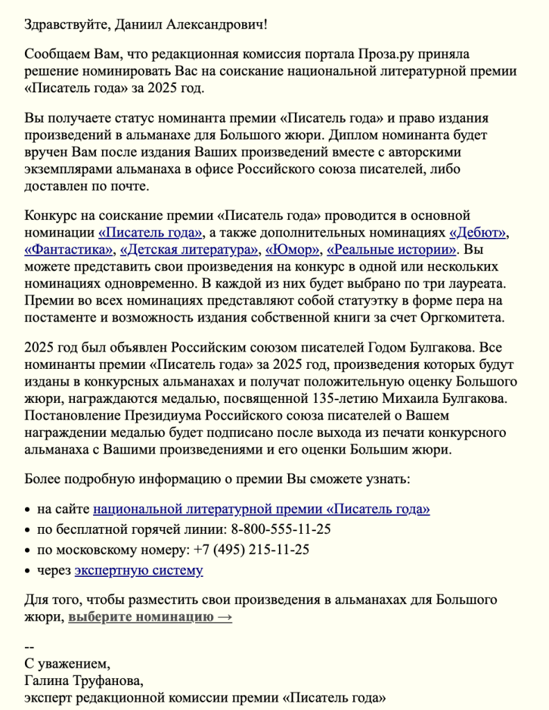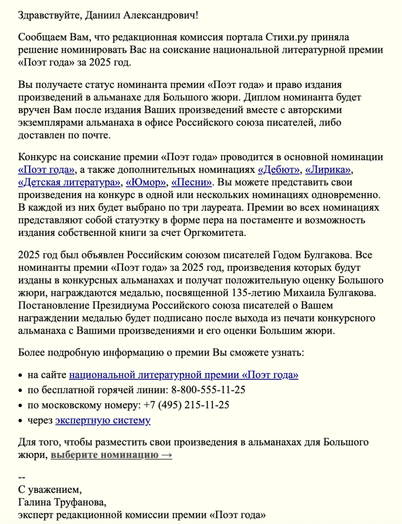 В конце 2025 года был номинирован на две престижные литературные премии «Писатель года 2025», «Поэт года 2025» и «Наследие 2026».